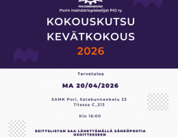 Tervetuloa vaikuttamaan tulevassa kevätkokouksessa tehtäviin päätöksiin! Kevätkokous pidetään SAMK Porin kampuksella 20.4.2026 klo 16.00 tilassa C213.